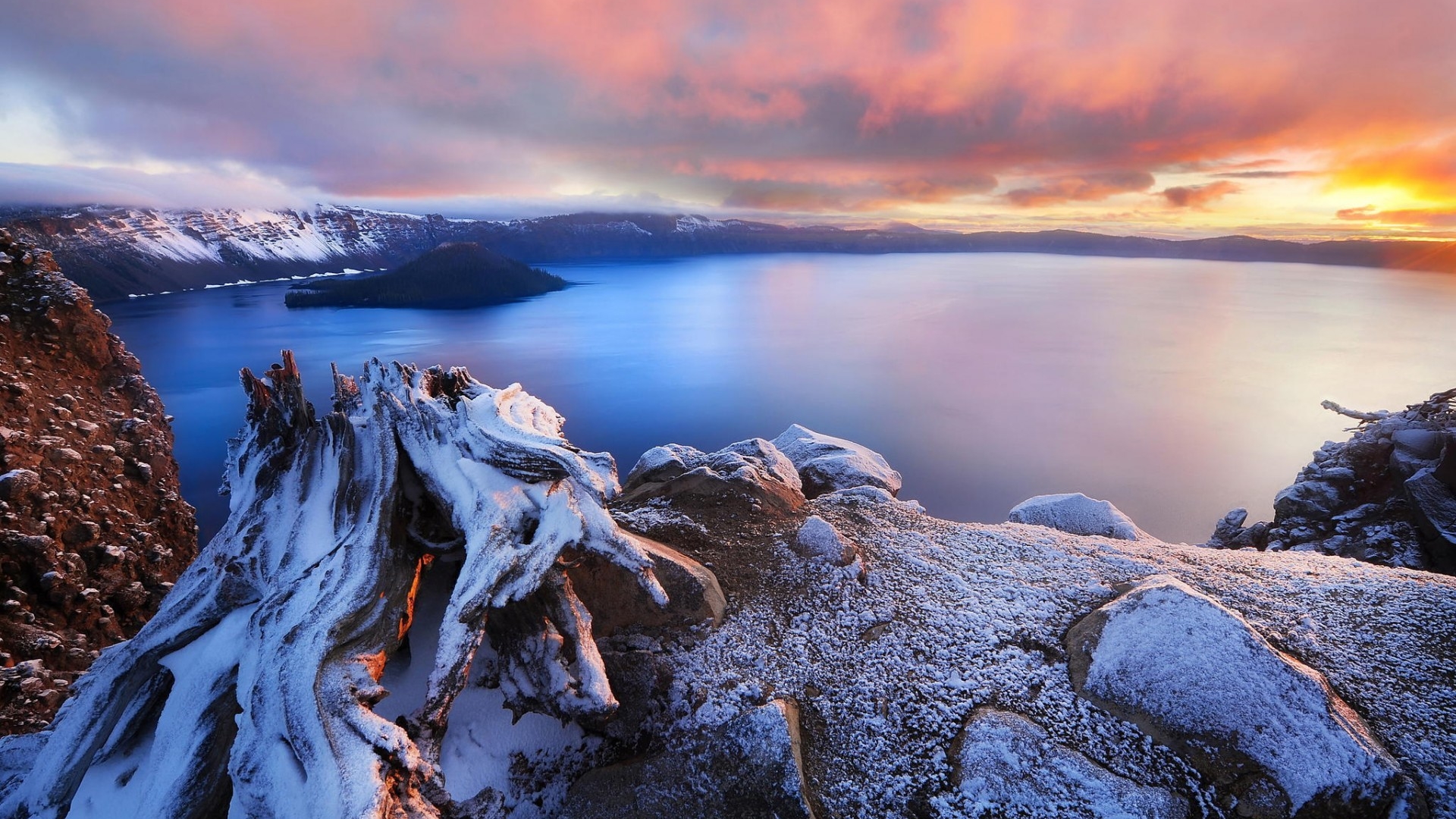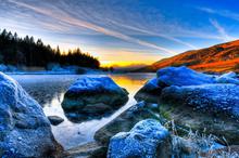 图集介绍:宁静的湖泊山水风景壁纸,下雪过后的的湖面显得特别的安静,蓝色的湖面上结了一层薄薄的冰,岸边的雪还没有融化,形成了一幅唯美的画面。