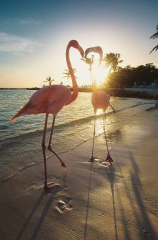 夕阳下沙滩火烈鸟群