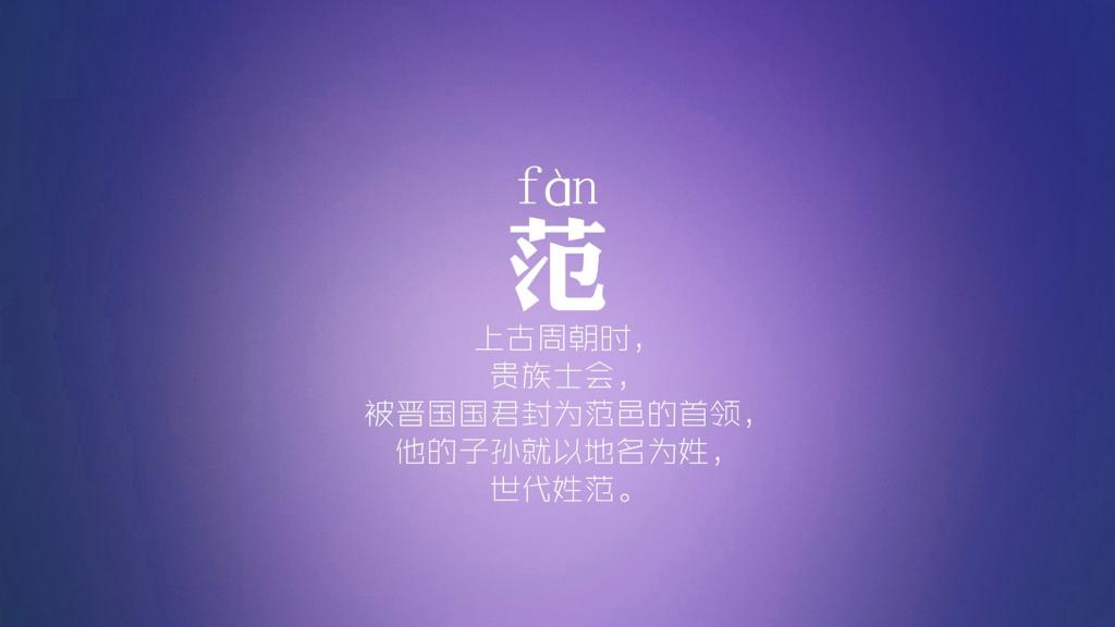 范Fàn:贵族士会,被晋国国君封为范邑的首领,他的子孙就以地名为姓。