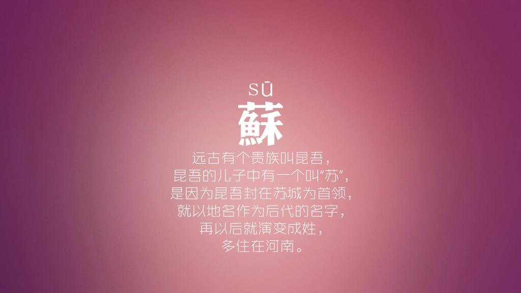 苏Sū:远古贵族昆吾,因为封在苏城为首领,就以地名为姓。