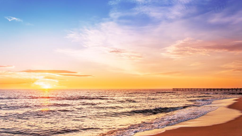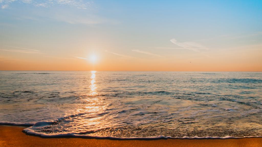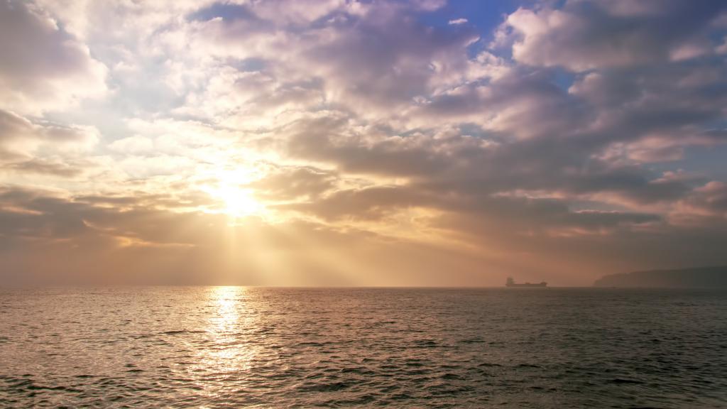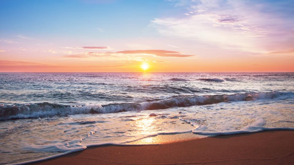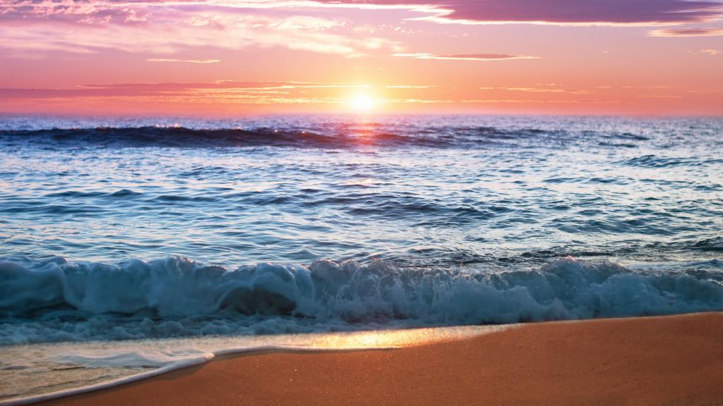 图集介绍:唯美海上日出风景高清桌面壁纸。太阳终于完全跳出海面,我无意顾及天上的云彩,但原来碧蓝的大海上在阳光的照射下,突然波光波光粼粼,金光闪闪,碧波荡漾,慰为壮观。