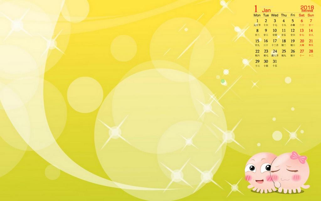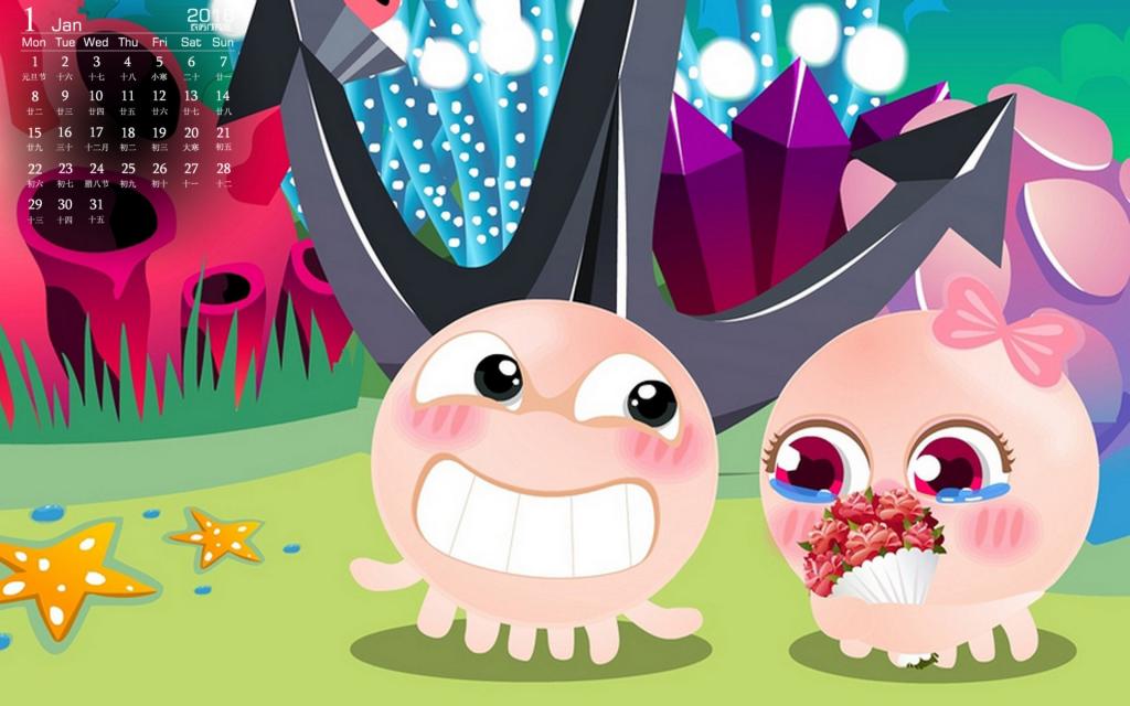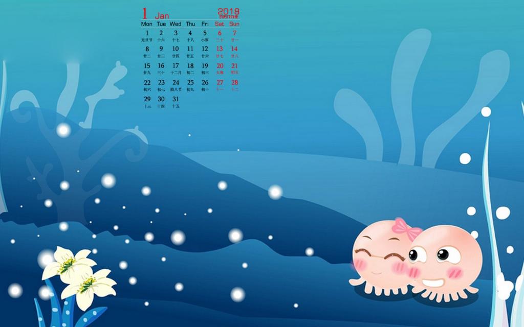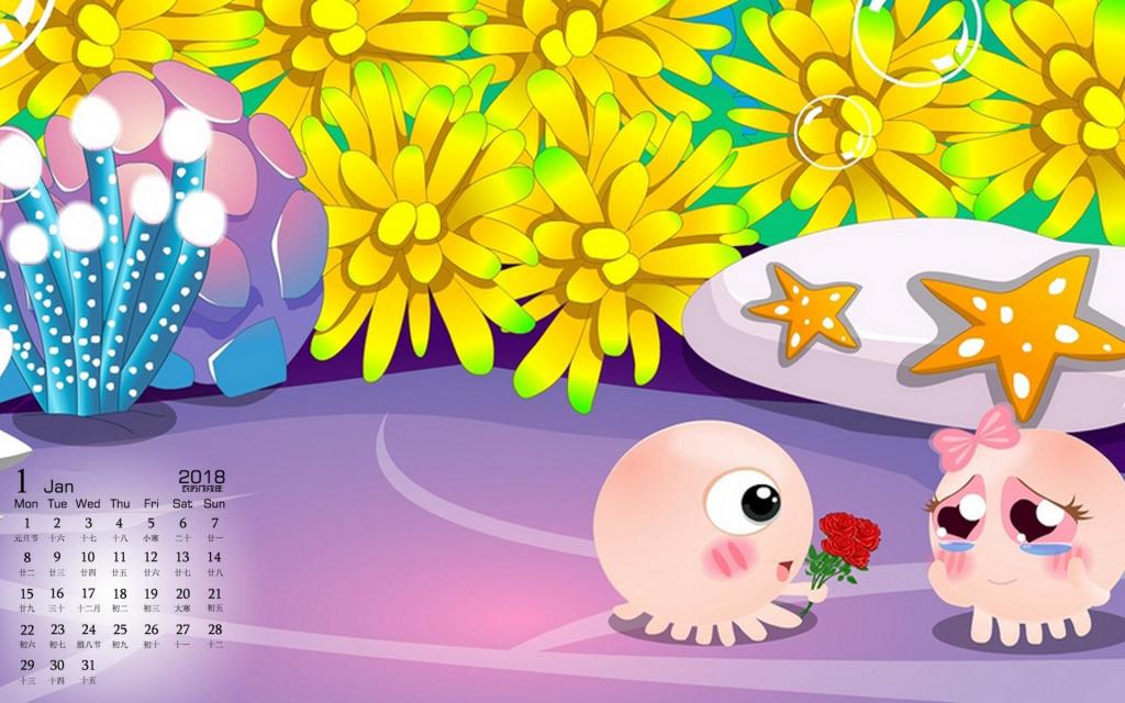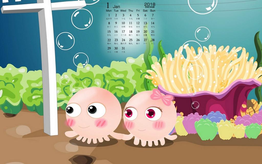 图集介绍:2018年1月NONO章鱼日历高清桌面壁纸。NOMO是一对生活在海底世界里的章鱼,NONO善解人意,幽默大方,偶尔多愁善感,陷入沮丧而不可自拔,在感情上对MOMO百依百顺,浪漫无比;在生活中总会营造快乐的气氛来呵护MOMO。