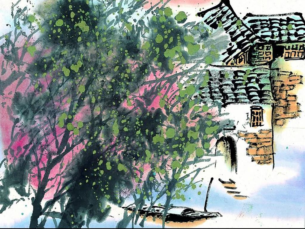 江南水乡夏季彩墨画