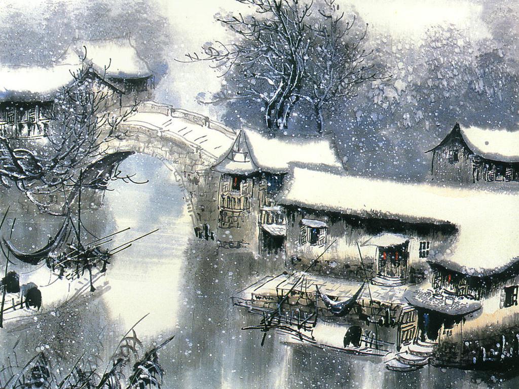 冬赏江南水乡水彩画