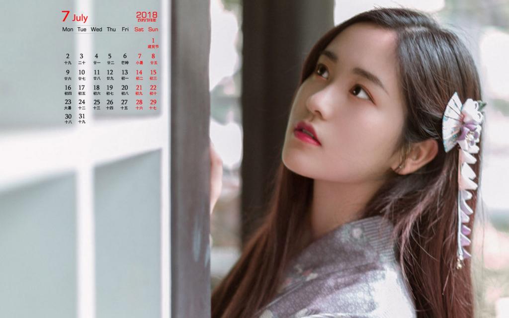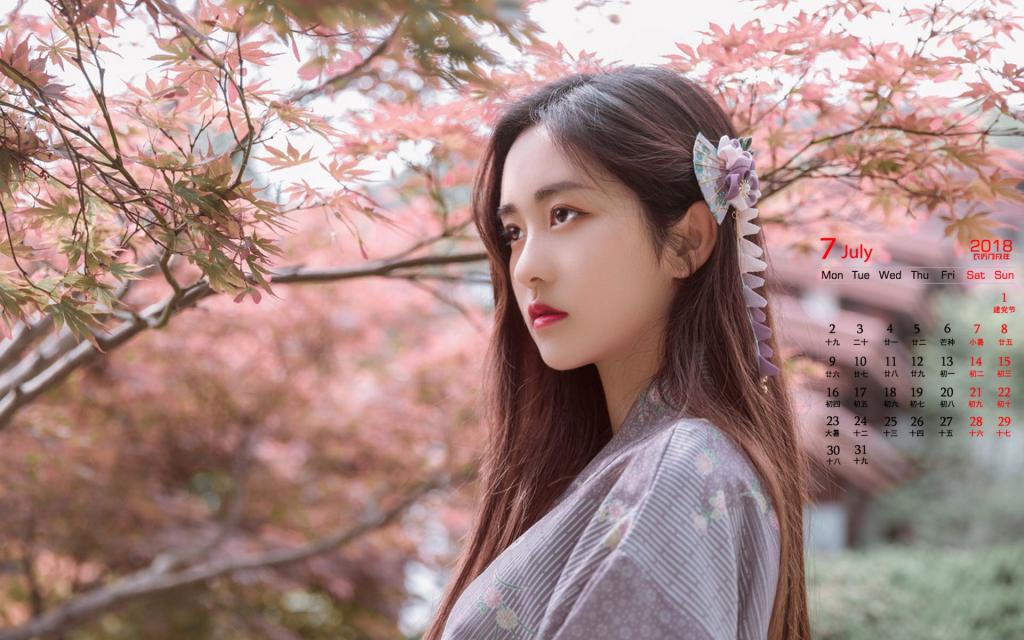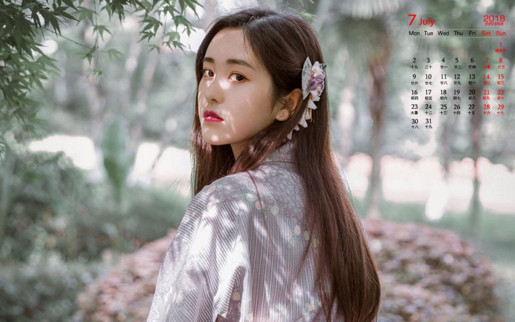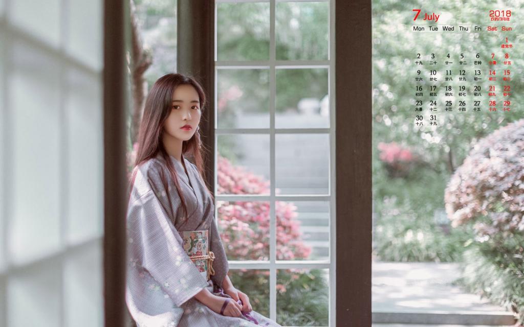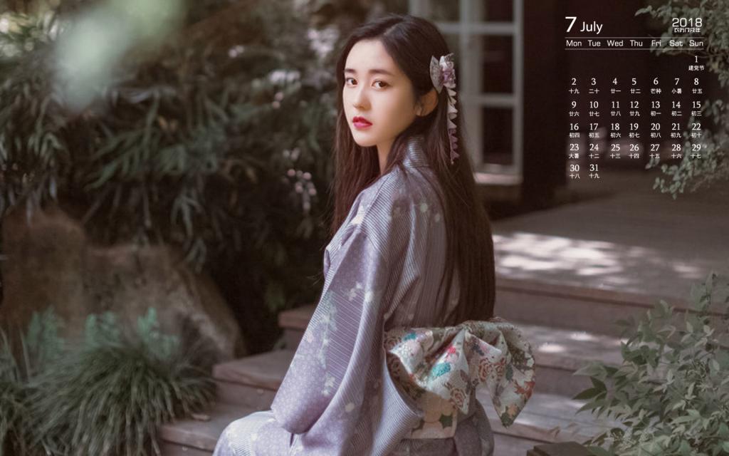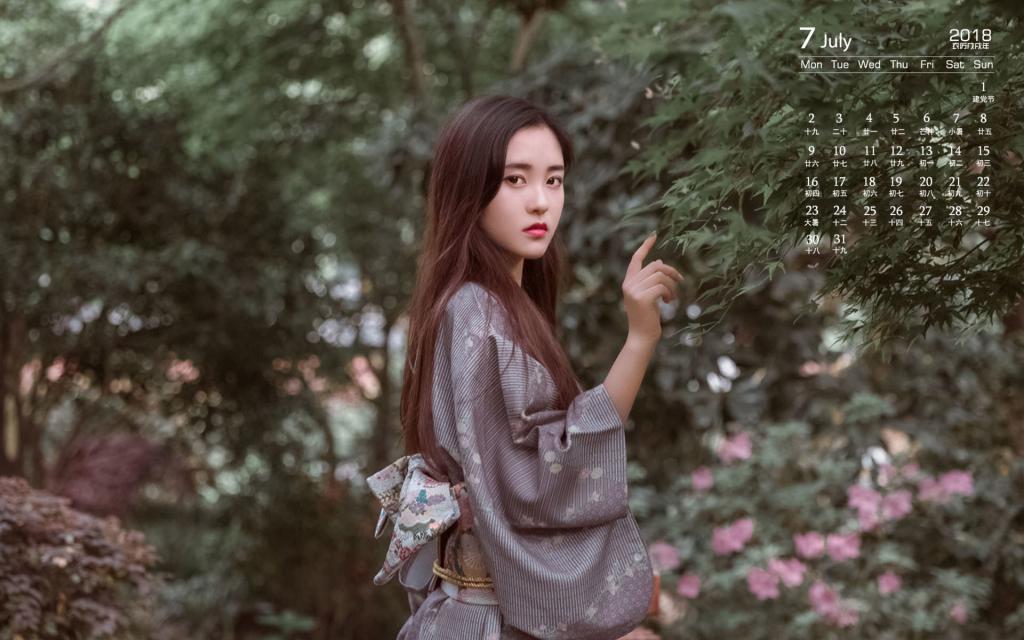 图集介绍:2018年7月气质美女图片日历壁纸,图片中的女孩身穿日本和服,皮肤白皙娇嫩,眼神清澈,气质温婉。