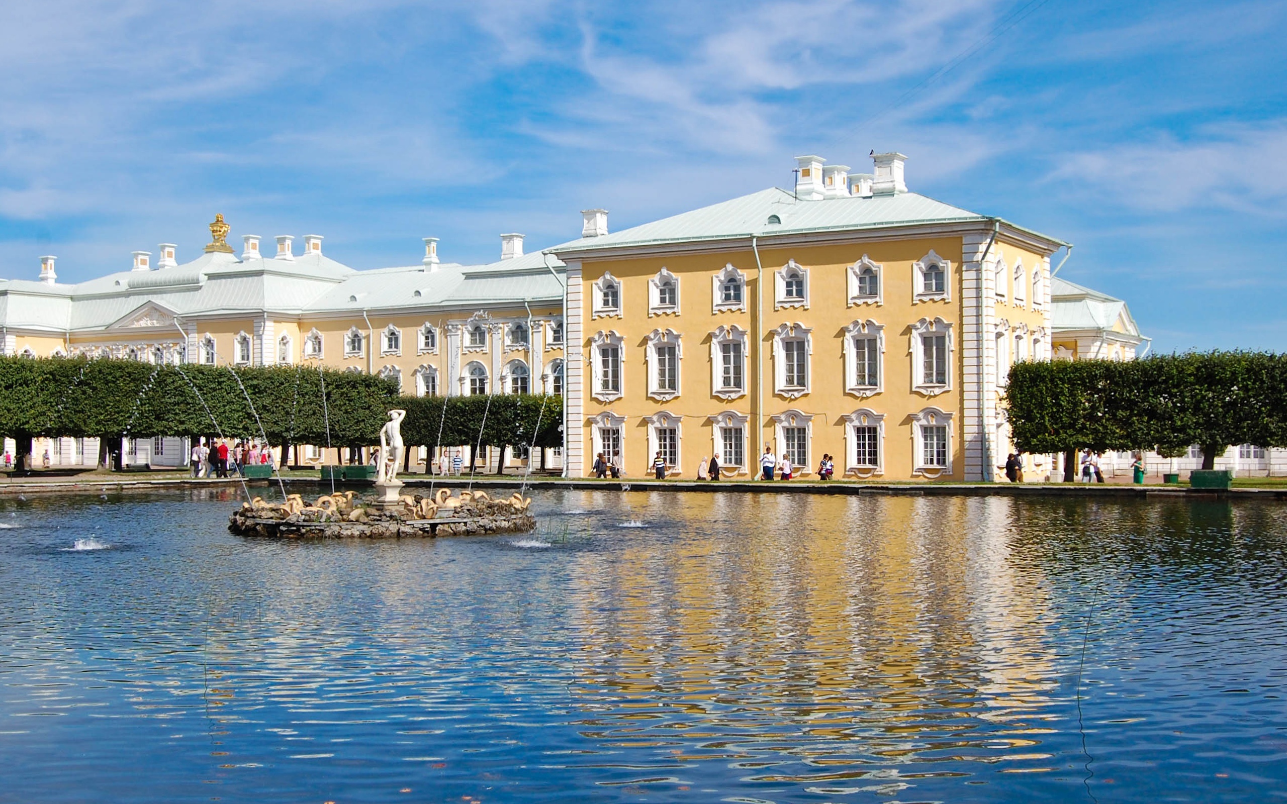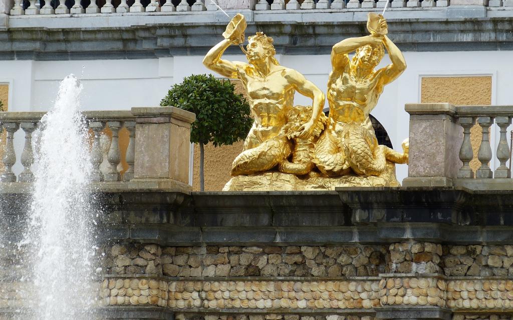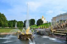 图集介绍:彼得大帝夏宫分为上花园和下花园,大宫殿在上花园。内外装饰极其华丽,两翼均有镀金穹顶,宫内有庆典厅堂。礼宴厅堂和皇家宫室。大宫殿前是被称作大瀑布的喷泉群。这里有37座金色雕像,29座潜浮雕,150个小雕像,64个喷泉及2座梯形瀑布。在喷泉群一个大半圆形水池的中央,耸立着大力士参孙和狮子搏斗的雕像,这就是著名的隆姆松喷泉。花园中金碧辉煌、布局美妙的喷泉和金色塑像,把夏宫富丽华美的一面集中展现在游人眼前。夏宫喷泉的全景相当壮观。