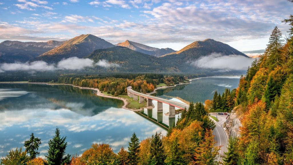 巴伐利亚州位于德国东南部,阿尔卑斯山横贯全州,多山峰,多森林,多湖泊是该州地形地貌的突出特征。阿尔卑斯山和高达2962米的德国最高峰祖格峰,阿尔卑斯山前沿地带上令人着迷的湖泊如基姆湖和柯尼希斯湖,巴伐利亚森林公园,弗兰肯汝拉山脉,菲希特尔山脉,施泰格尔森林,施佩萨尔特山以及其他许多地带向旅游者提供了欣赏自然和休养身心的难得的机会。