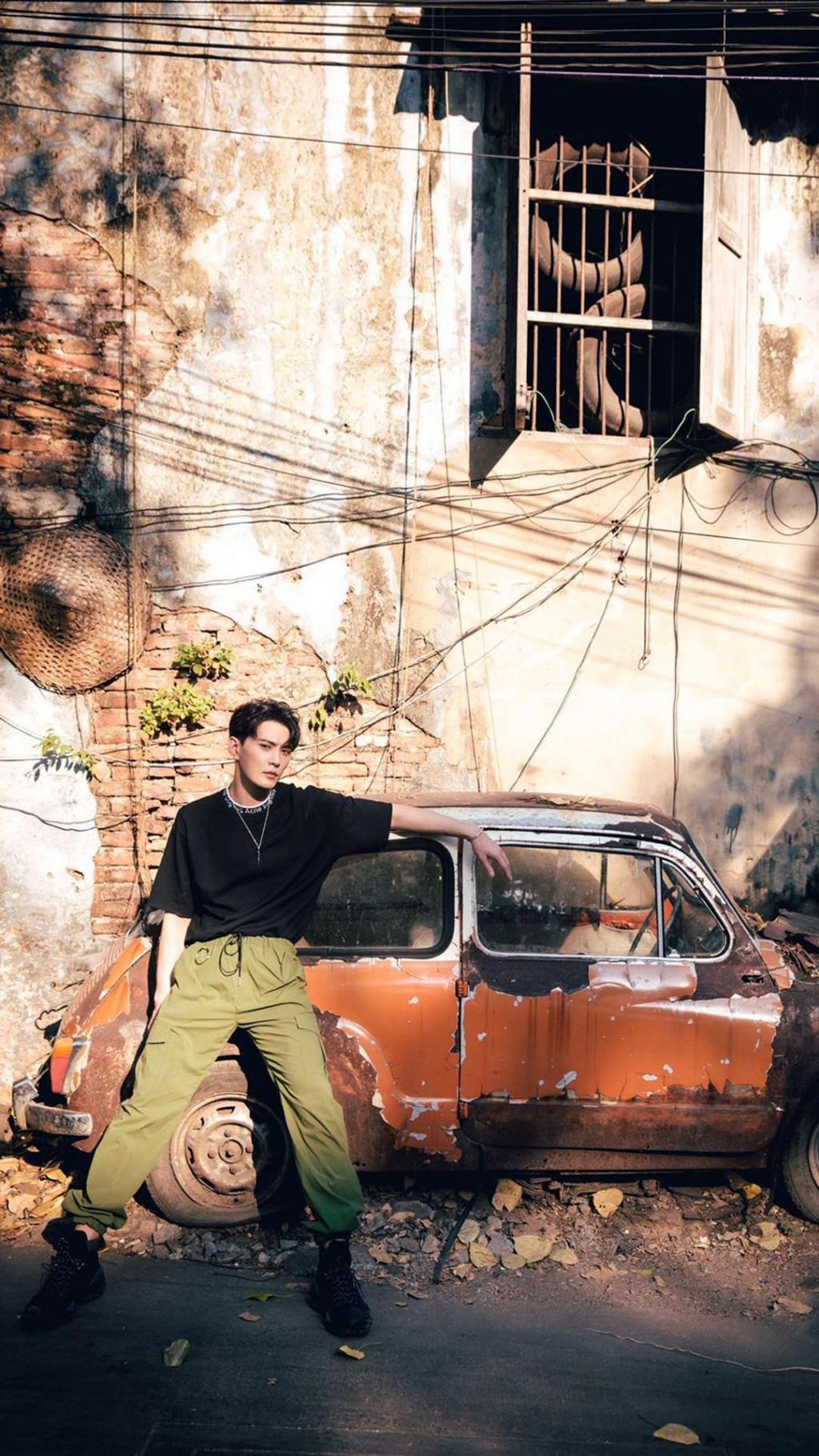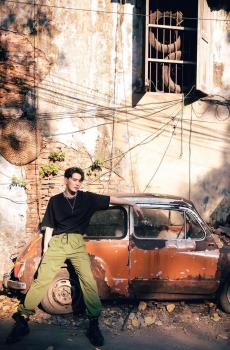 图集介绍:徐正溪黑色体恤搭配绿色工装裤,潮男造型,不仅时尚有型,而且尽显男子帅气。