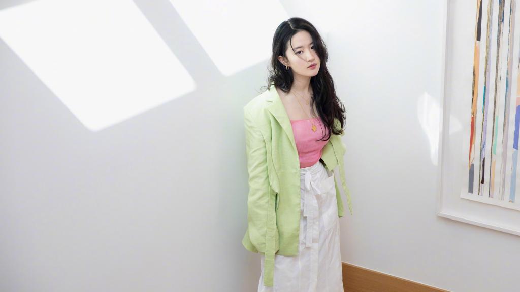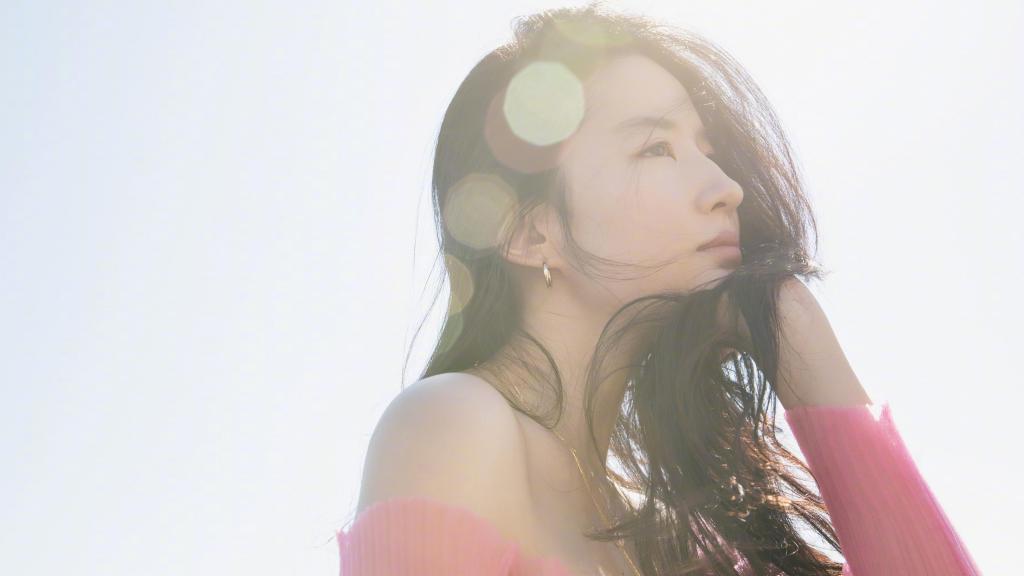 图集介绍:神仙姐姐刘亦菲清新气质写真电脑壁纸:刘亦菲身穿粉色露肩紧身长袖搭配白色长裙,外搭青绿色西装外套,一头长发披在肩上,气质十足。