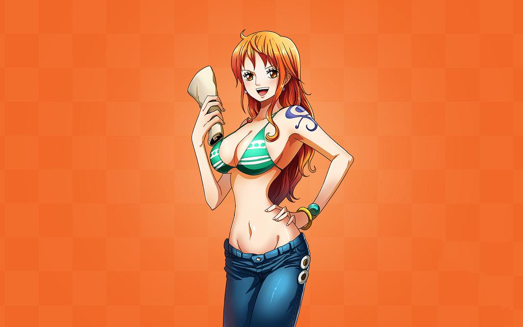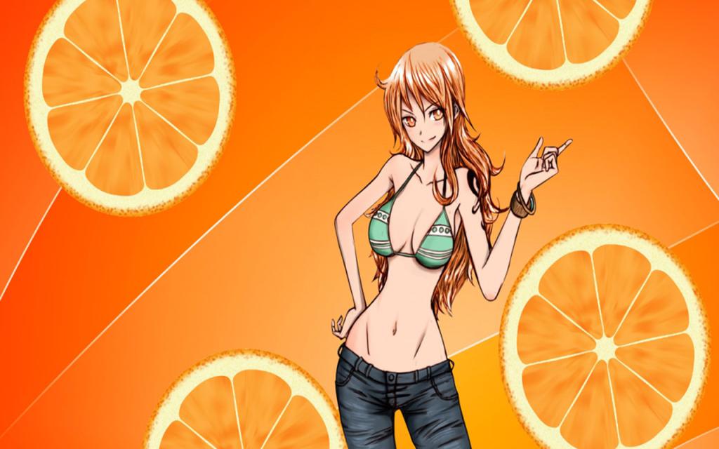 图集介绍:海贼王主角之Nami娜美电脑壁纸,娜美的外貌特征是一头漂亮的橘色头发与左肩的橘子风车刺青。