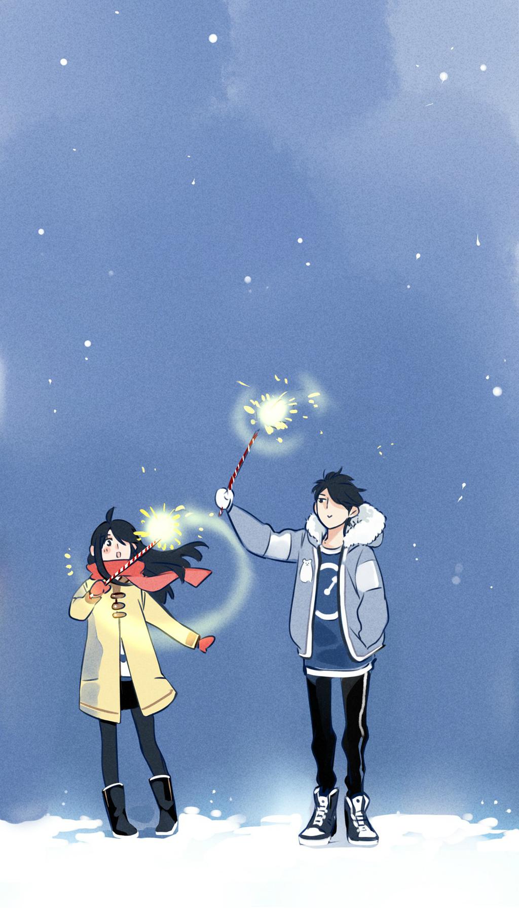 情侣专属复古风动漫手绘插画