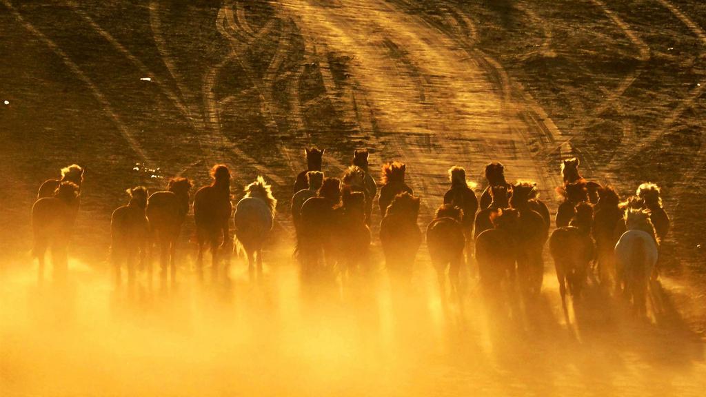 图集介绍:夕阳下奔跑的马群壁纸,气势雄壮,四蹄生风的骏马,奔腾在一望无际的沙漠上,显示出一股巨大的力量。那强劲的铁蹄,仿佛响着"嗒嗒"的蹄声。