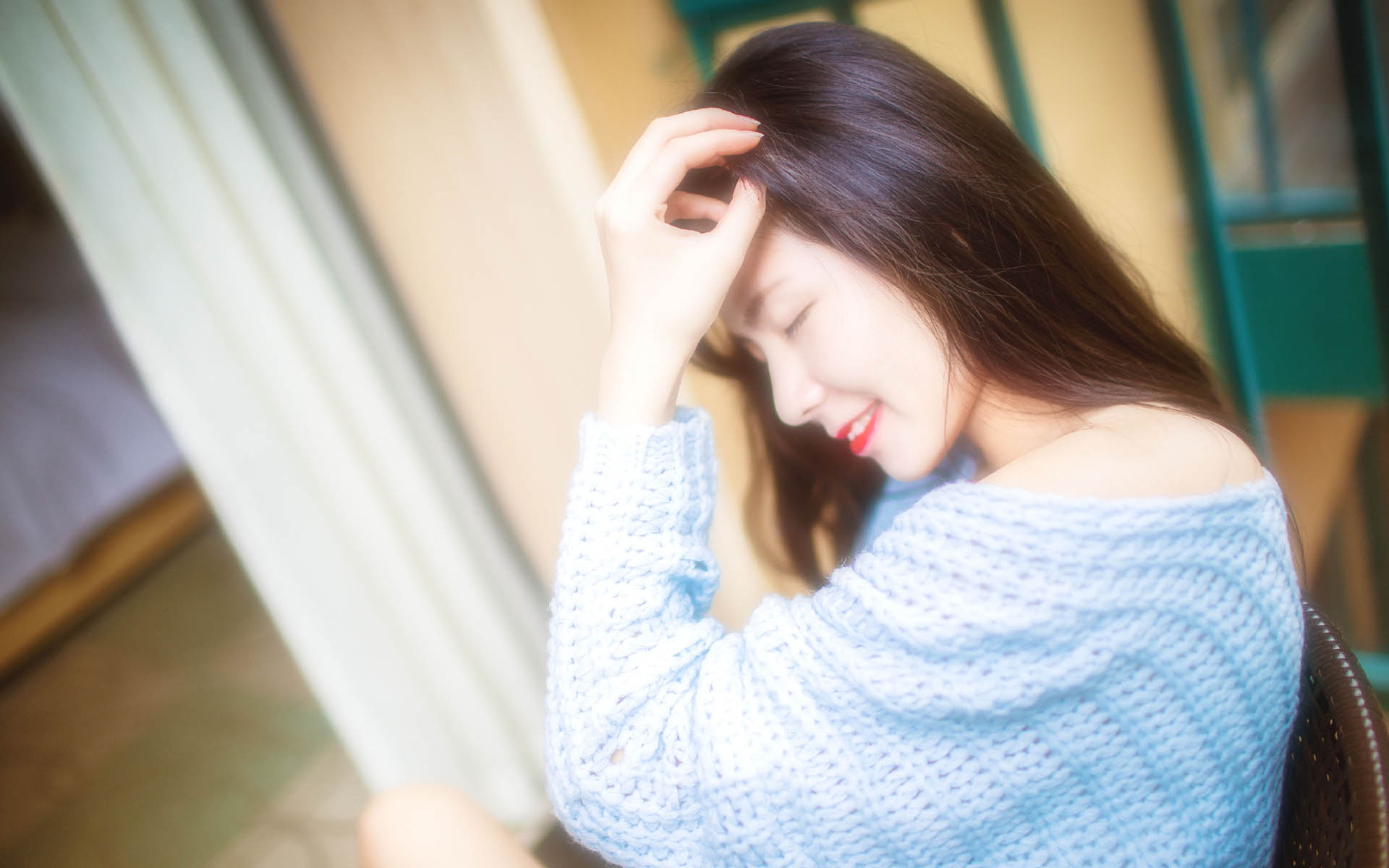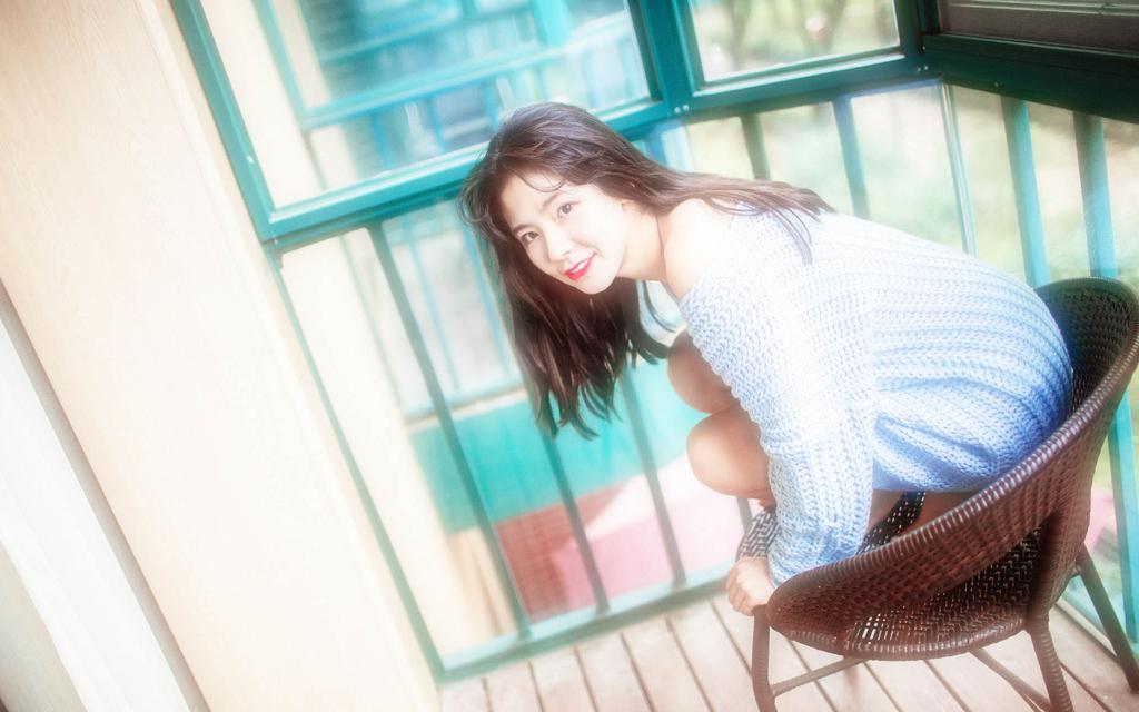 图集介绍:梦幻美女日系室内写真电脑高清桌面壁纸,梦幻美女穿着天蓝色的毛衣,在室内摆弄各种姿势,性感撩人,有一种独特的朦胧美。