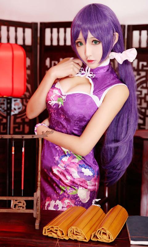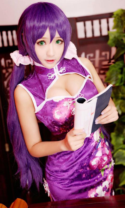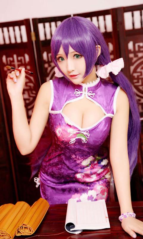 图集介绍:东条希cos手机壁纸,性感的爆乳cos美女,穿着紫色的旗袍,戴着紫色的头发,她展现出了女人性感妩媚的一面。