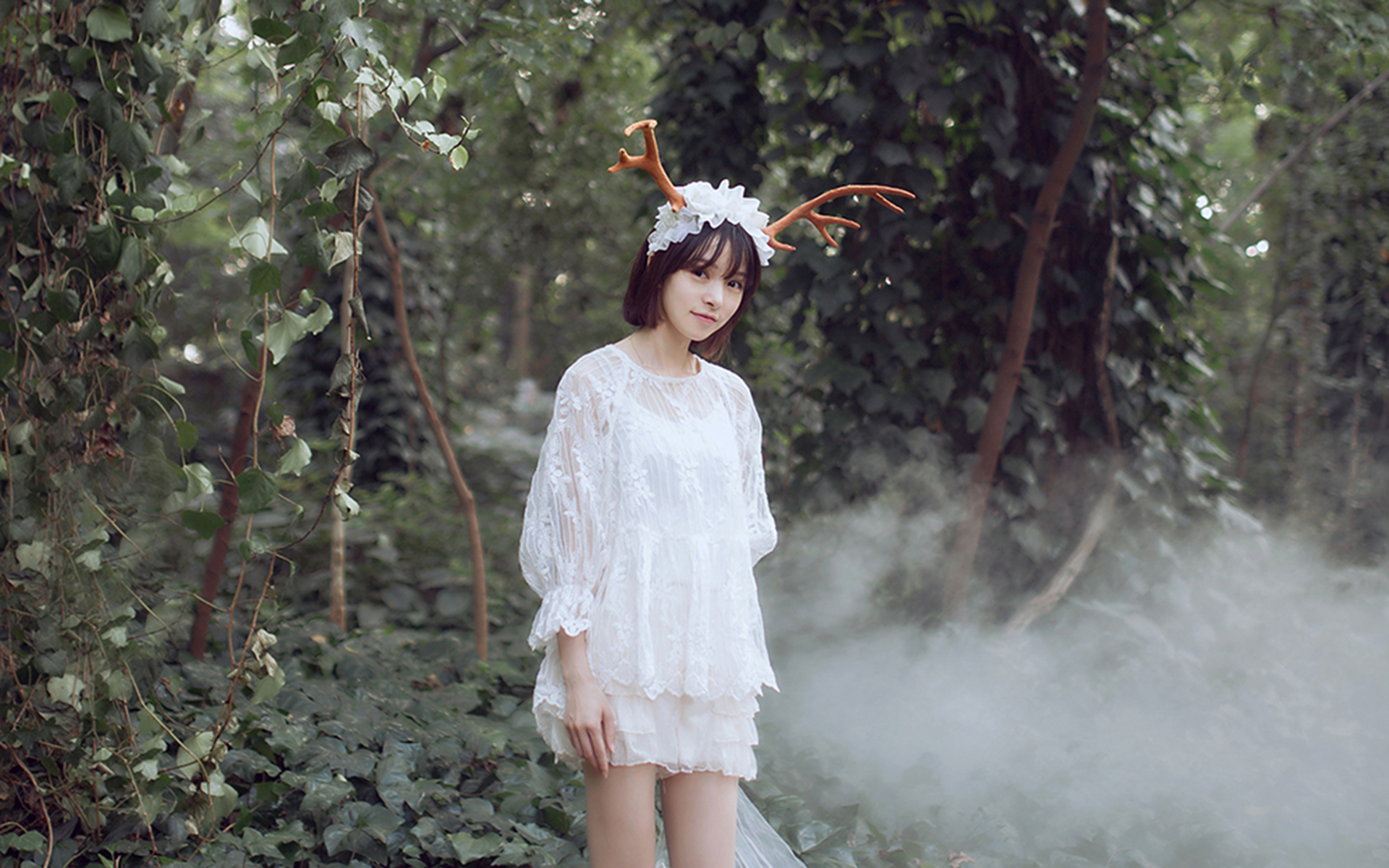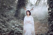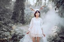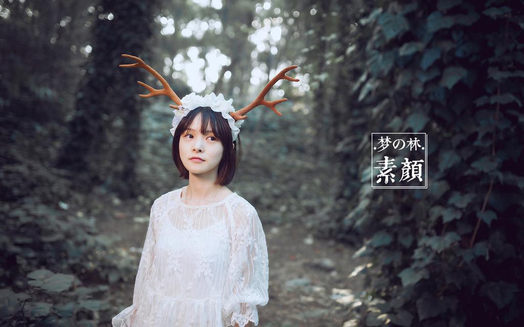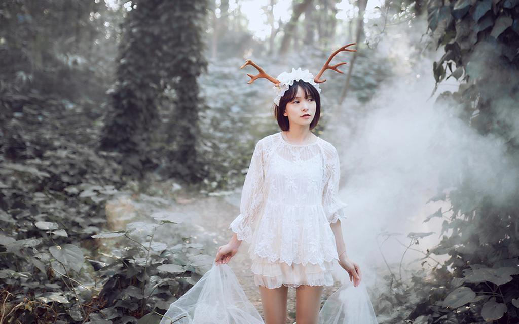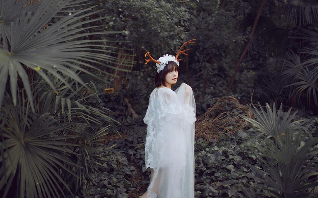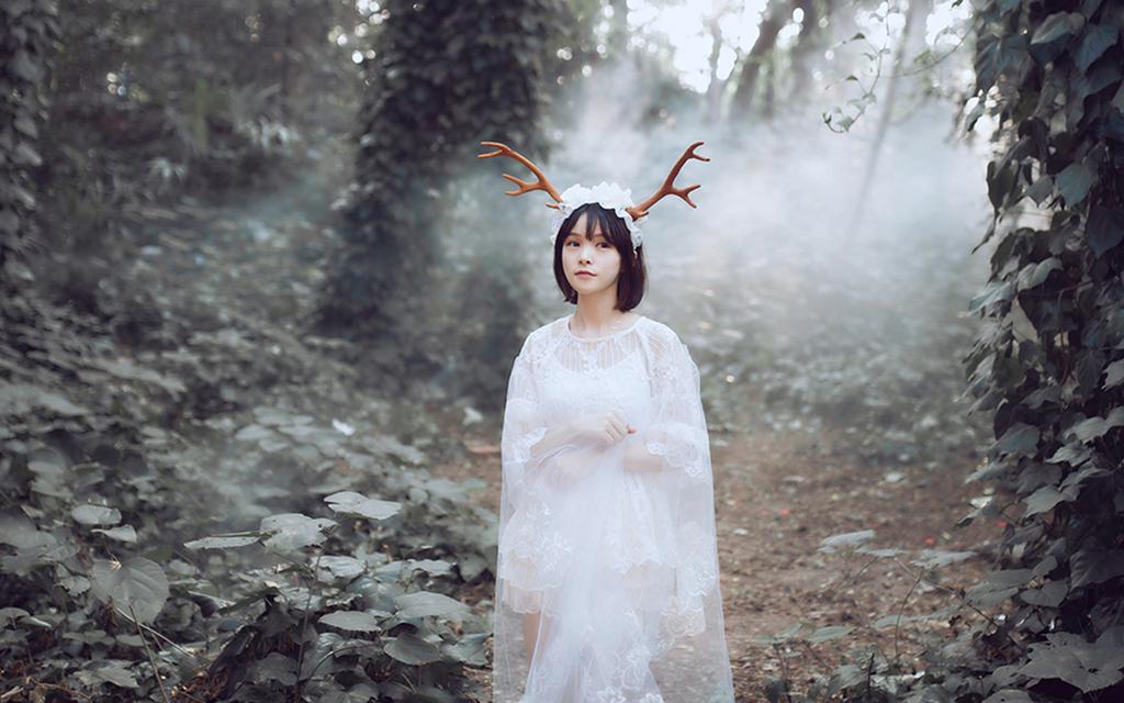 图集介绍:可爱日系软妹子丛林梦幻写真壁纸,身穿着白色的裙子置身于森林中,头上插了鹿角,像是森林里的一只麋鹿。