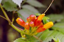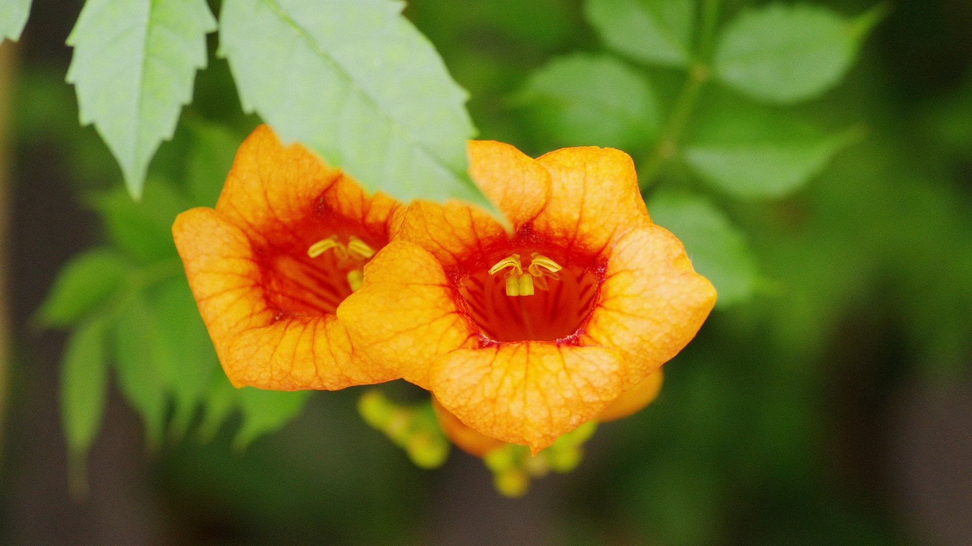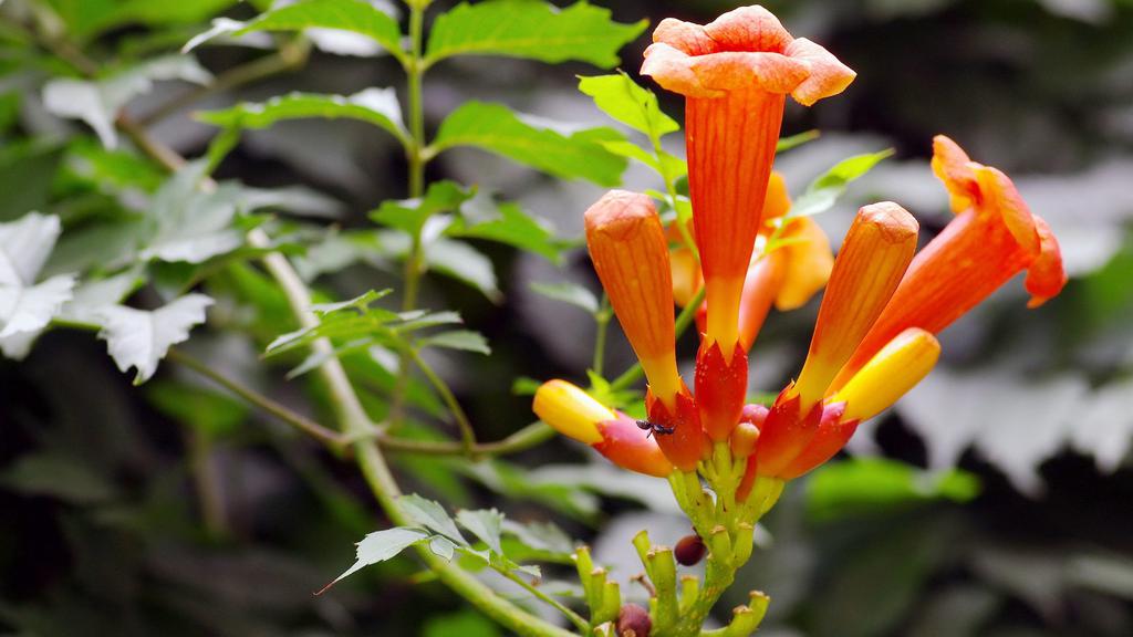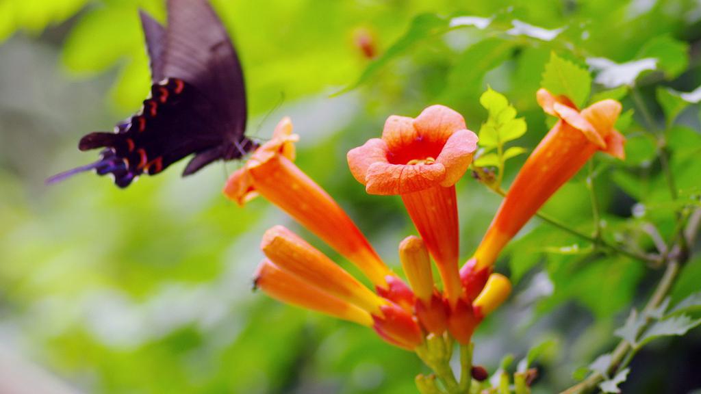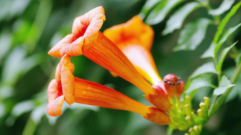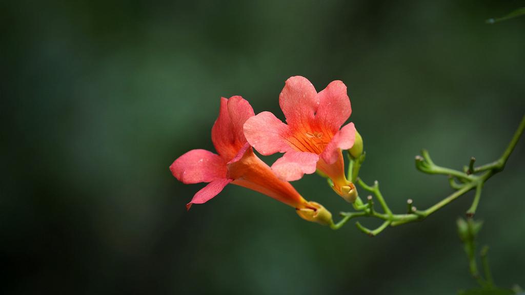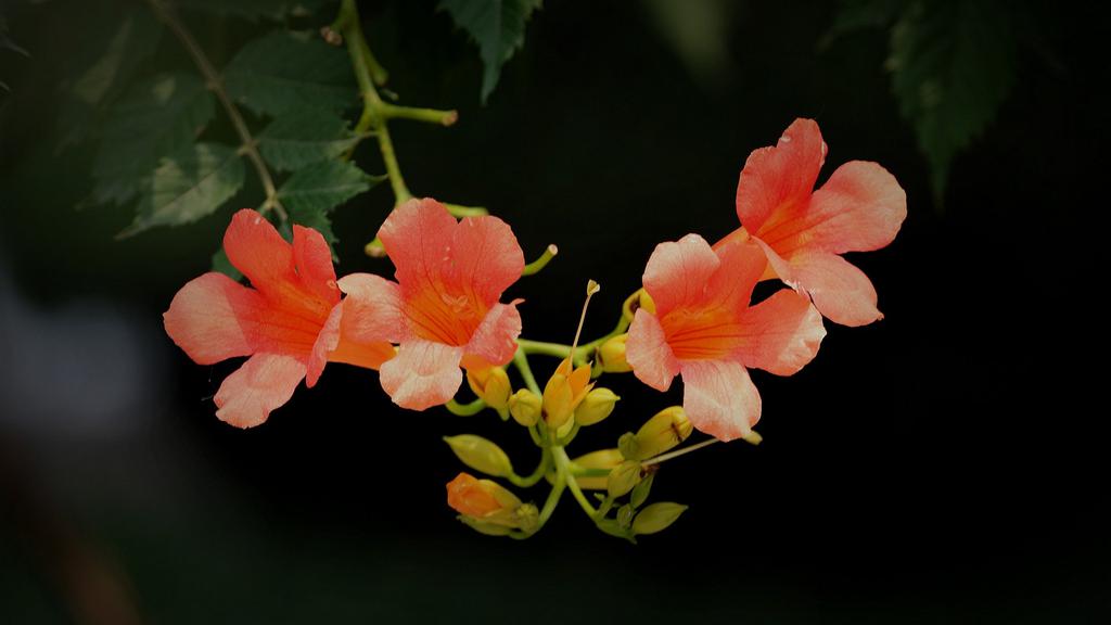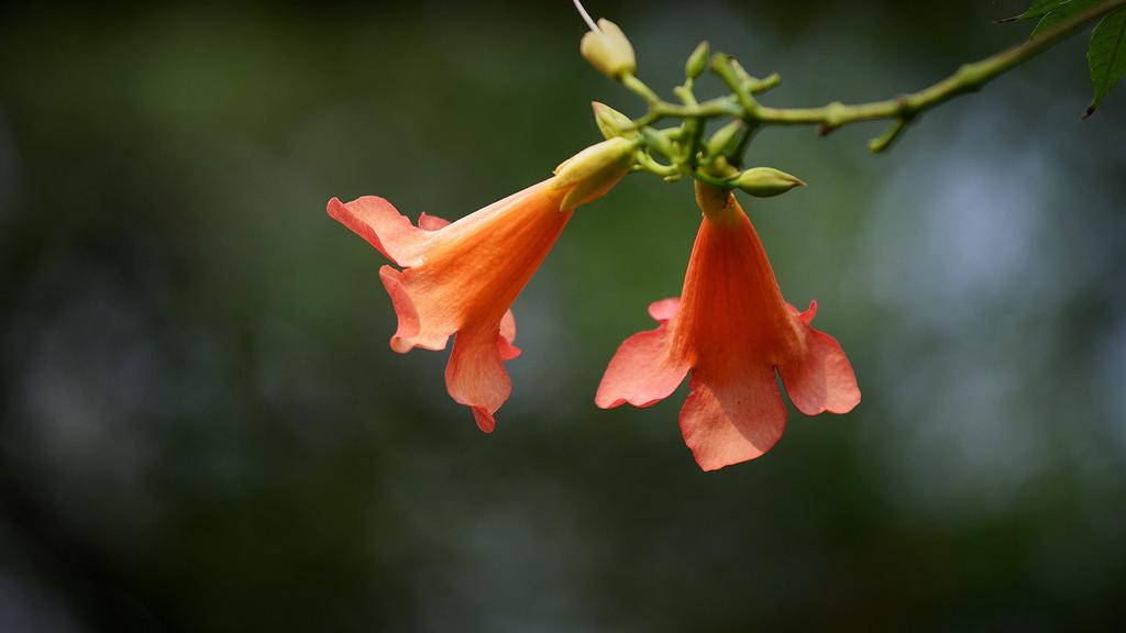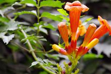 图集介绍:橘色唯美清新凌霄花图片壁纸,橘色的花卉,类似于牵牛花的形状,开在枝头的它一小簇一小簇的相拥着,唯美清新动人的自然美景。