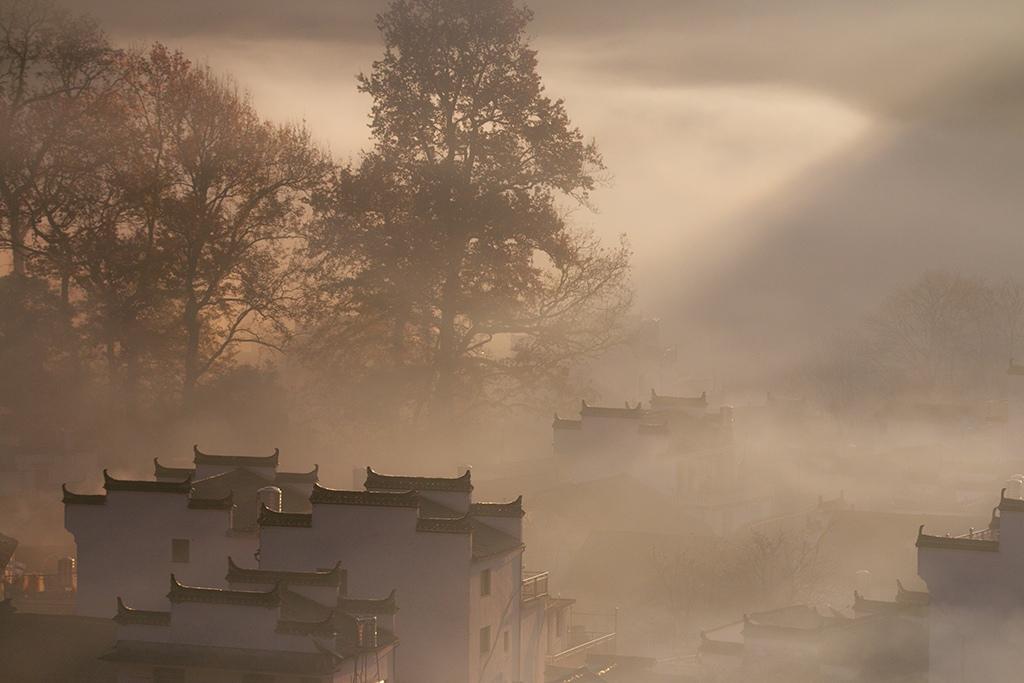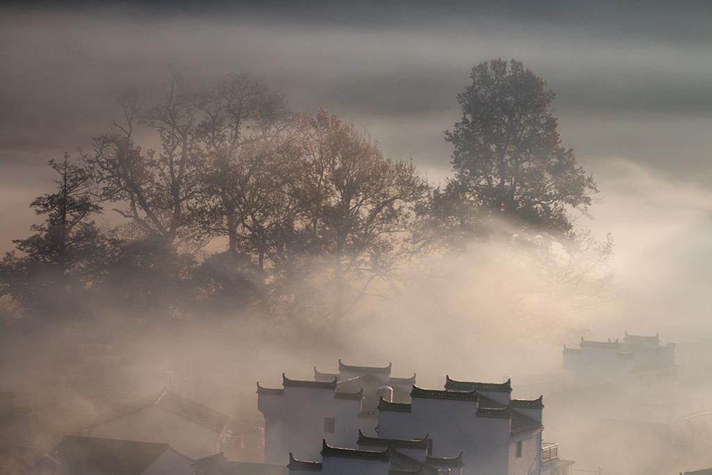 图集介绍:清晨下的婺源石城古村:江西省婺源县石城古村落粉墙黛瓦的民居在烟雾中若隐若现,与傲霜红枫交相辉映,美不胜收。石城古村在江西省上饶市婺源县西北的古坦乡境内,村头有石壁,岩如古城,危耸的城“墙”内外有许多古树名木,其中最让人惊叹的就是这里的百来棵枫树,每棵树高都在35米以上,远远超过村里的高矮屋顶,和巨大而且笔直向上的树冠相比,黑瓦白墙徽派建筑简直就是玩具屋子。