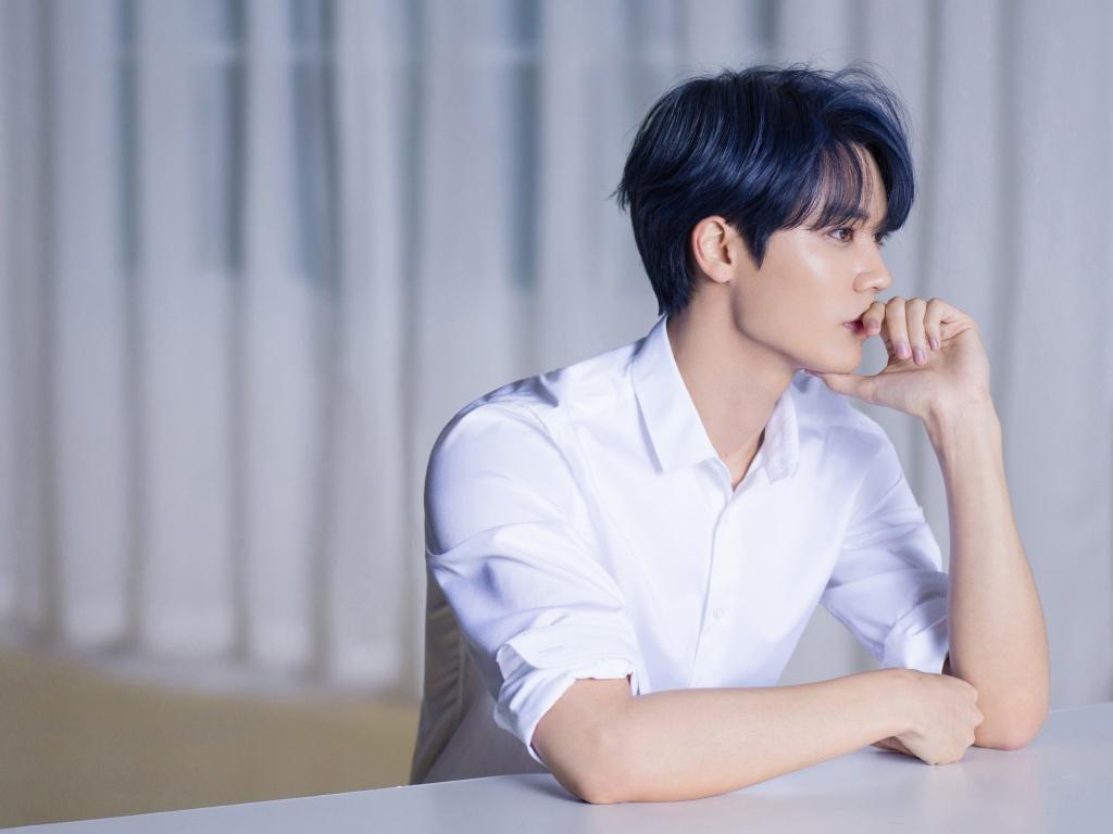 图集介绍:林彦俊时尚休闲帅气蓝发写真:清爽造型,白色简约服饰,潇洒阳光。