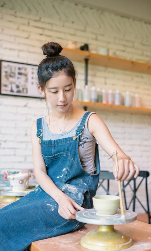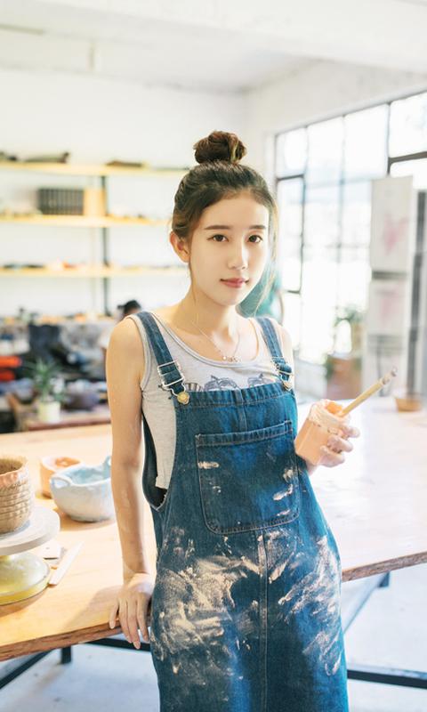 图集介绍:陶艺白衣美女唯美写真手机壁纸,小清新可爱的小美女,扎着小清新的花型,简约装扮,白色上衣加上牛仔裤裙子,给人一种很是安静的生活状态。