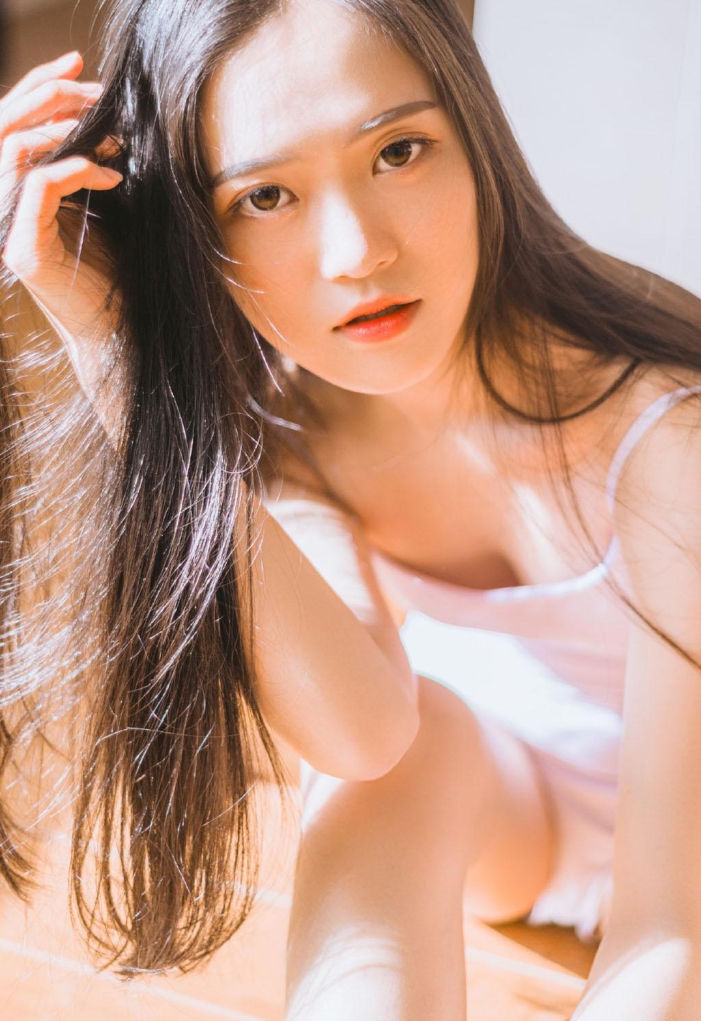 粉色吊带裙美女性感海边撩人写真