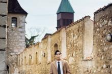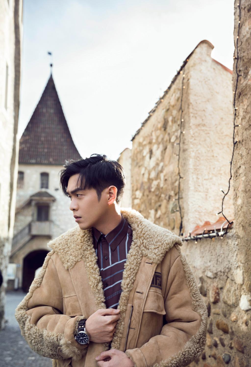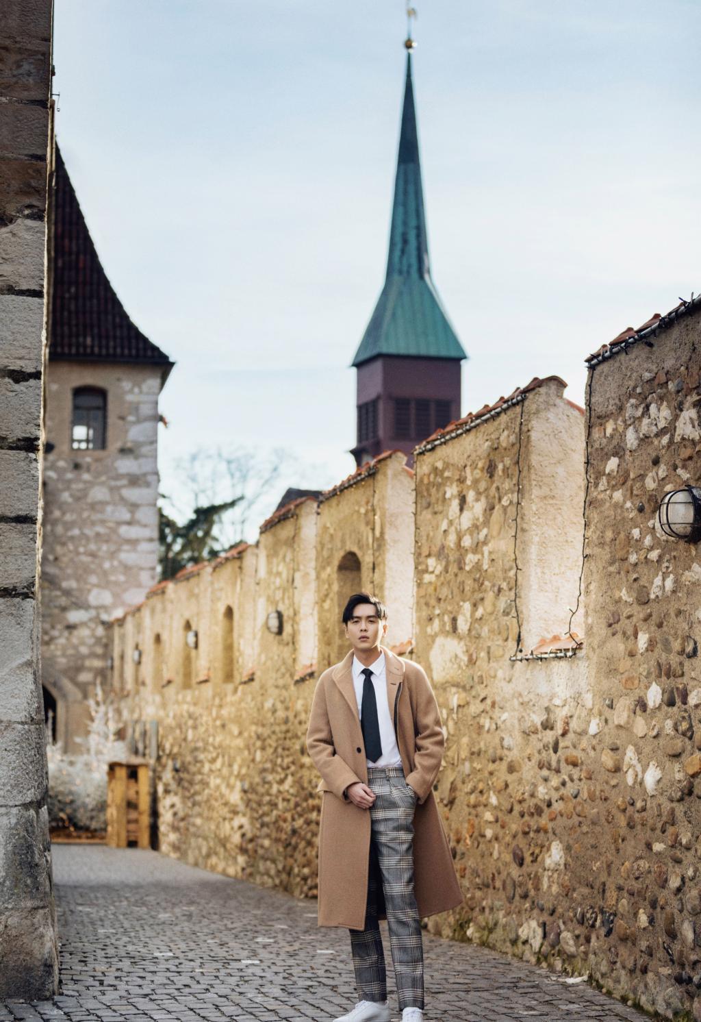 图集介绍:张若昀身穿驼色宽松廓形大衣搭配格纹休闲裤,身处日内瓦古堡街边,慢下时光寻找一份惬意和休闲。