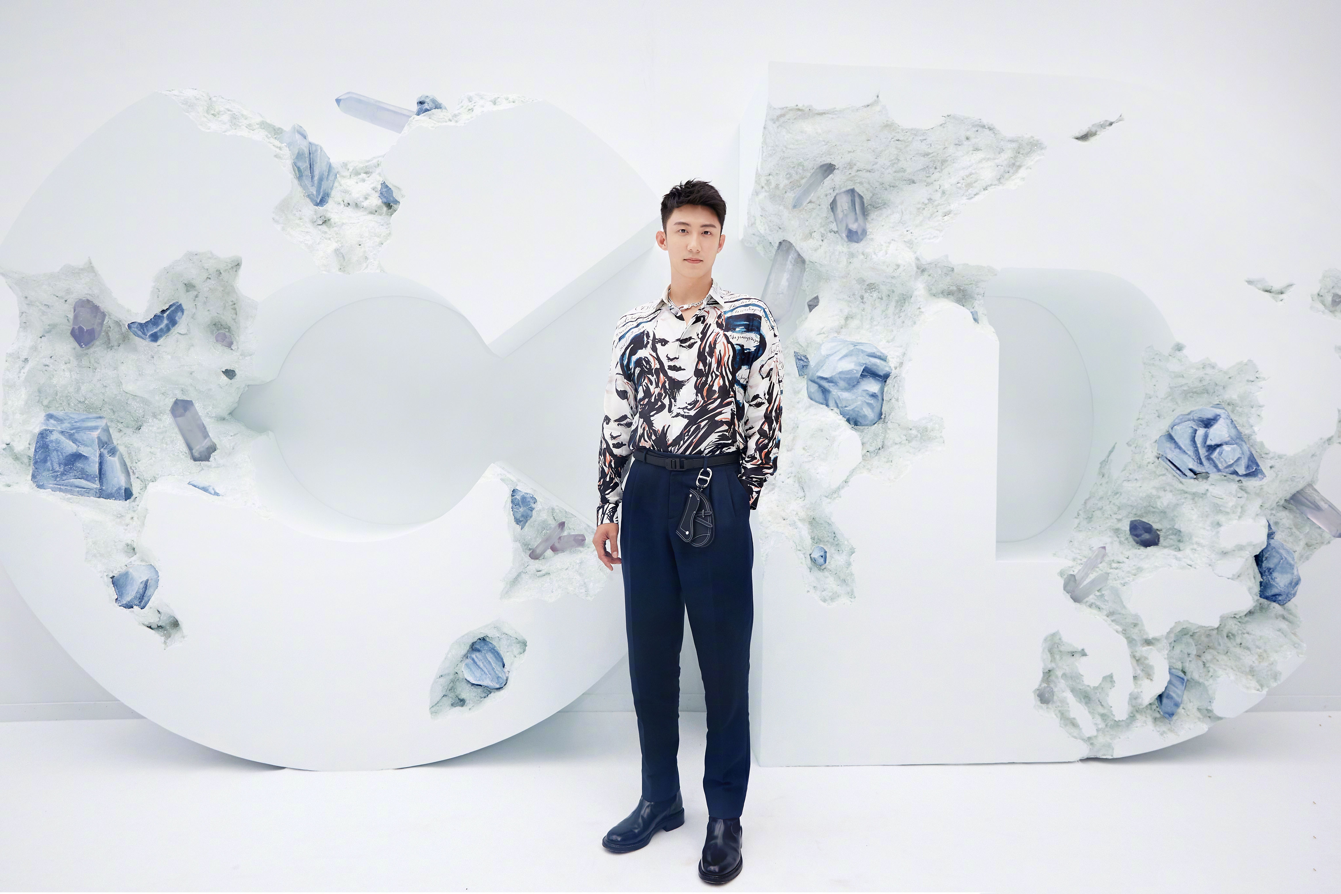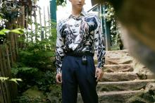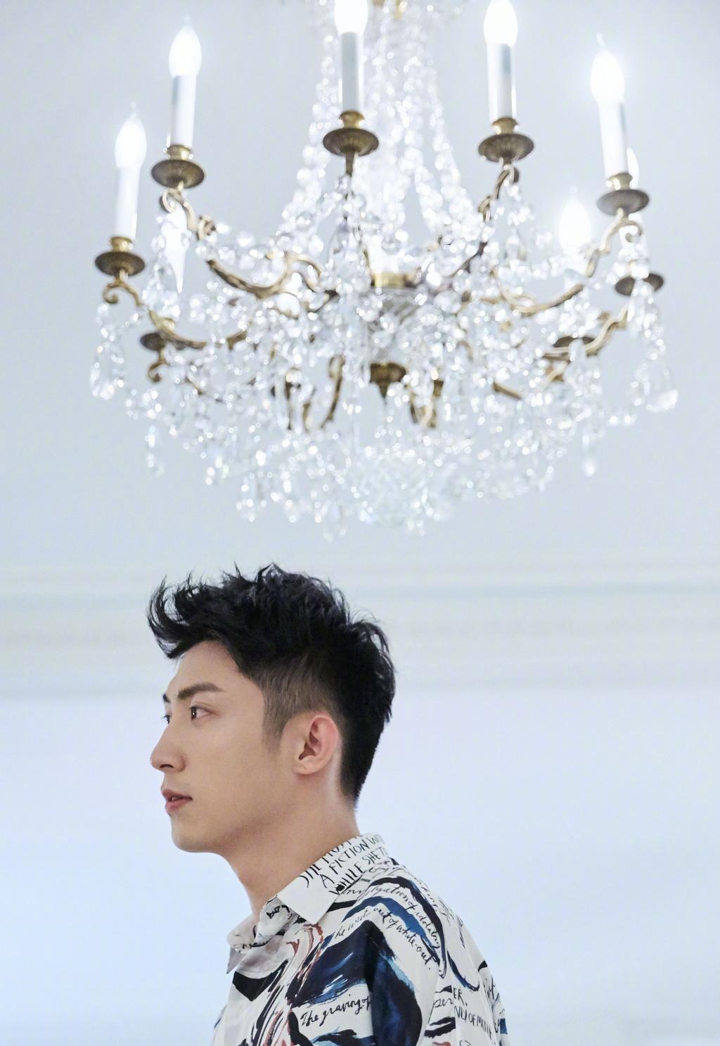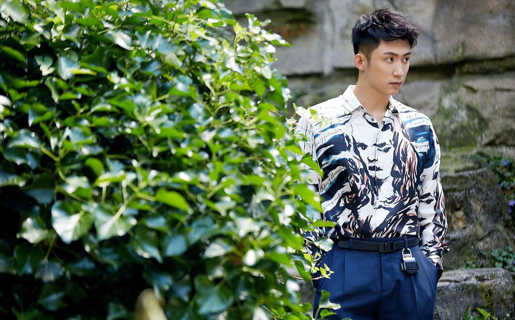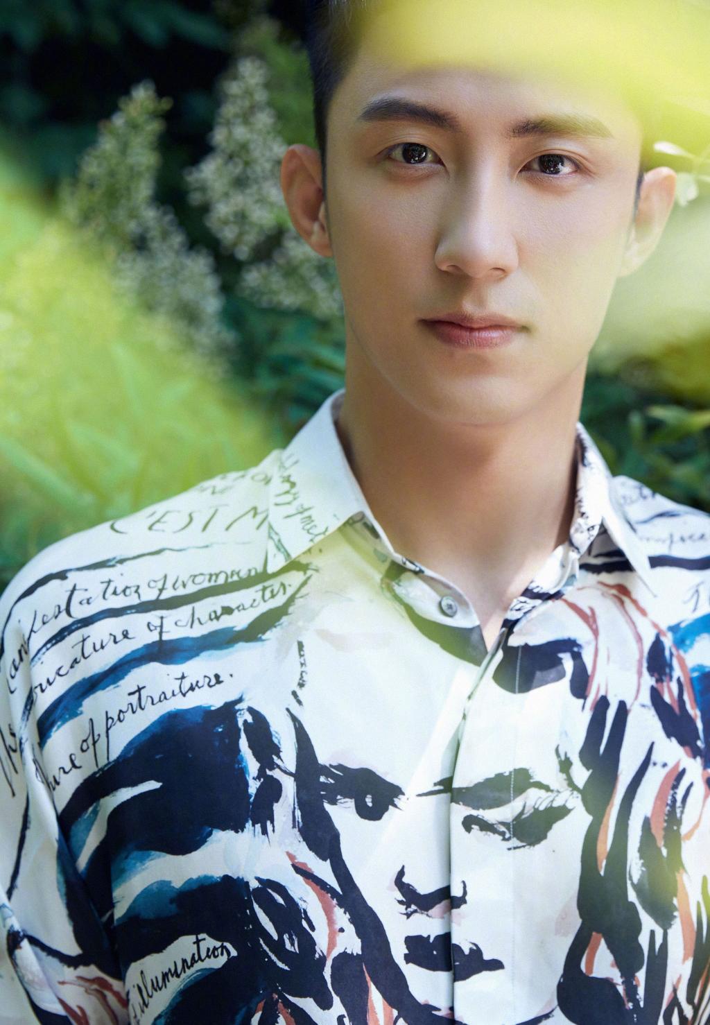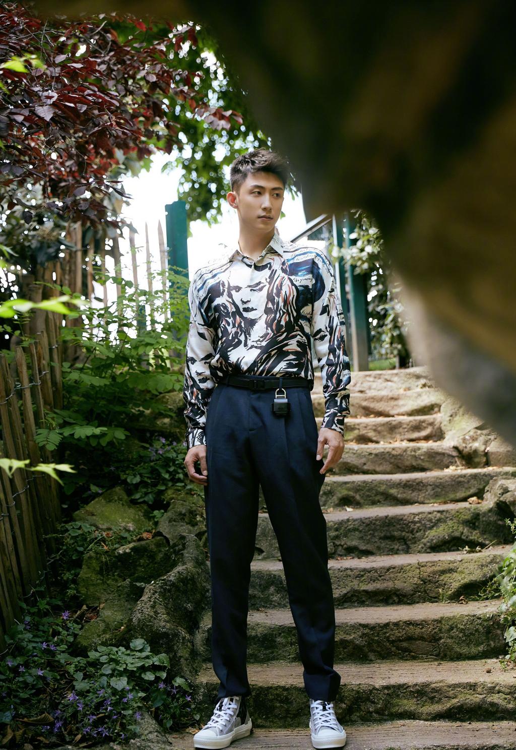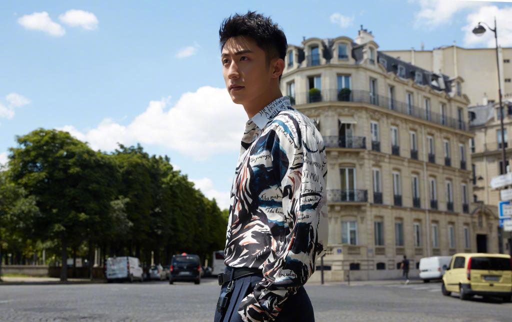 图集介绍:黄景瑜身穿独特设计的蒙娜丽莎衬衫,深色纹路与白底相间,整体风格简约但设计感十足。