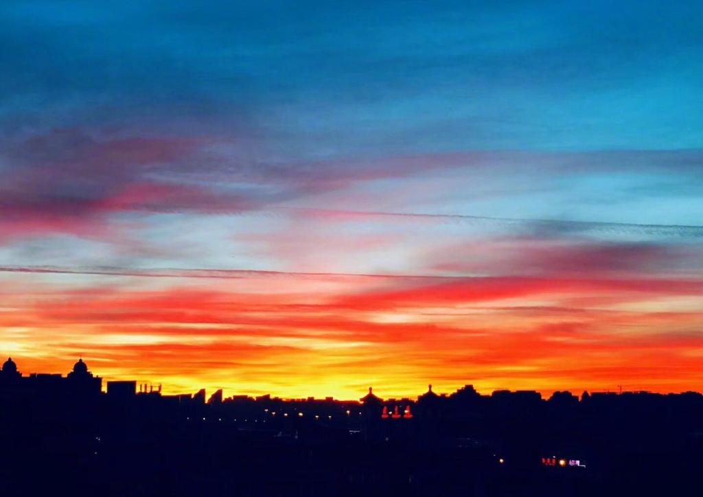 图集介绍:北京天空现罕见绚丽朝霞:北京天空现罕见朝霞奇观,冉冉升起的太阳光辉将半边天空染得通红,美就一个字!