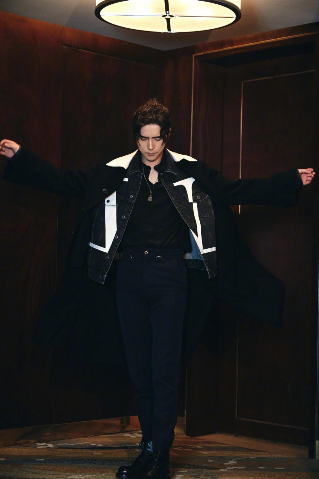 图集介绍:阿云嘎身穿黑色长款大衣内搭字母拼色牛仔,高腰牛仔搭配纯色马丁靴,尽显霸道总裁风范!