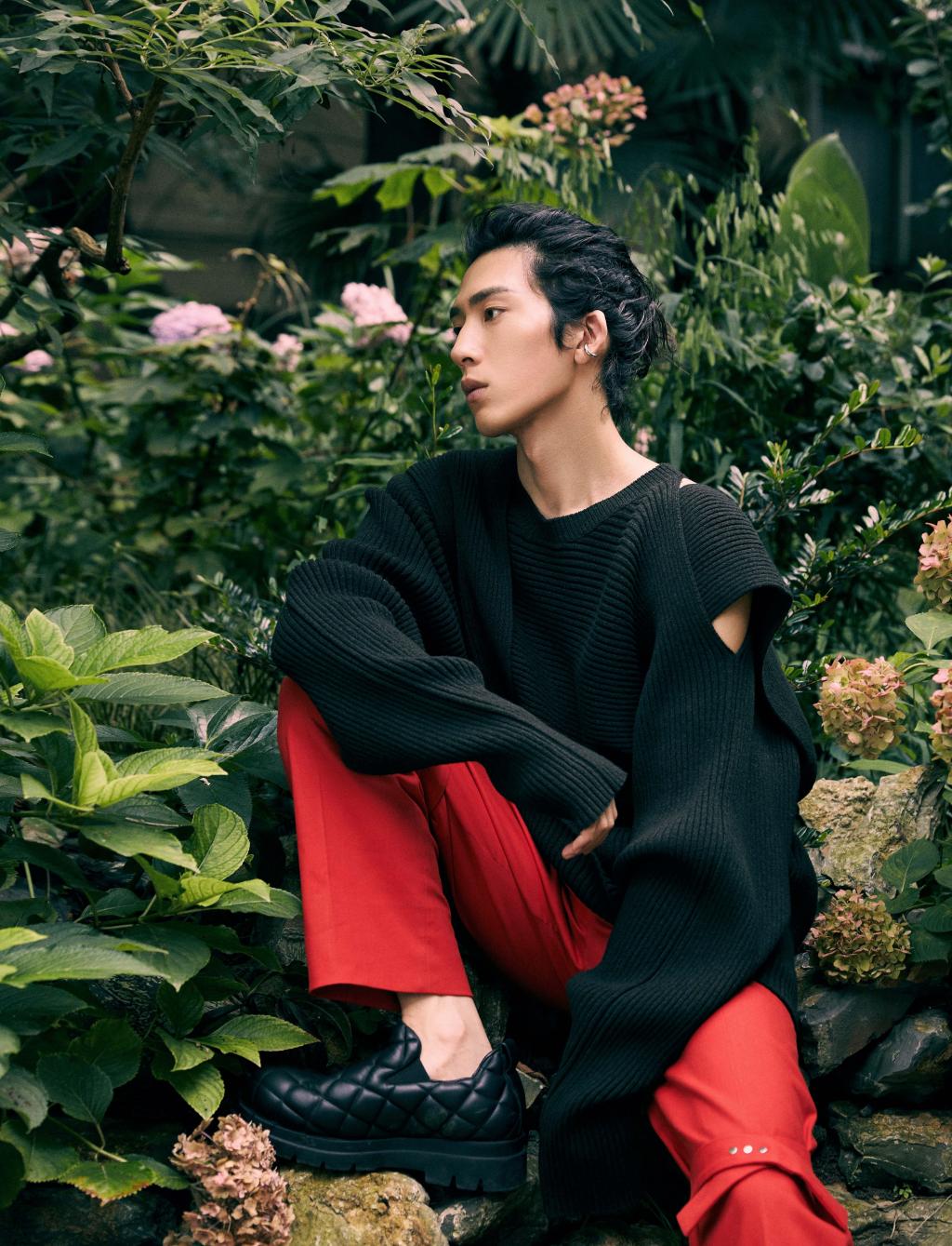 图集介绍:井柏然身穿黑色镂空毛衣搭配红色长裤,慵懒的束发造型,文艺范儿十足,绅士优雅。